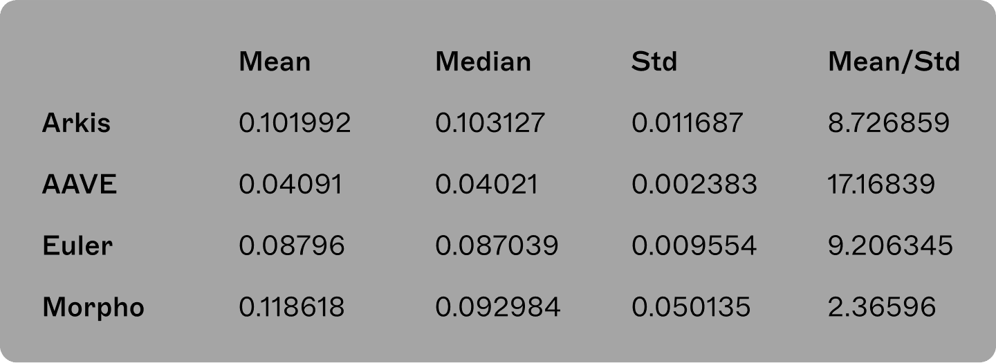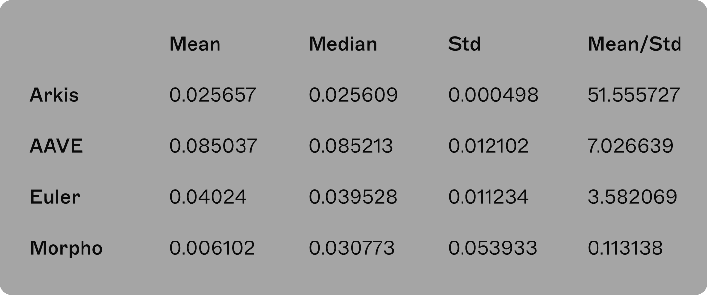 Even though Arkis provided the lowest average and median spread compared to AAVE, Euler and Morpho, it provided a much more stable arbitrage environment (Arkis has substantially lower standard deviation of spread and by far the biggest value of “stability score” - mean/standard deviation” of net spread).