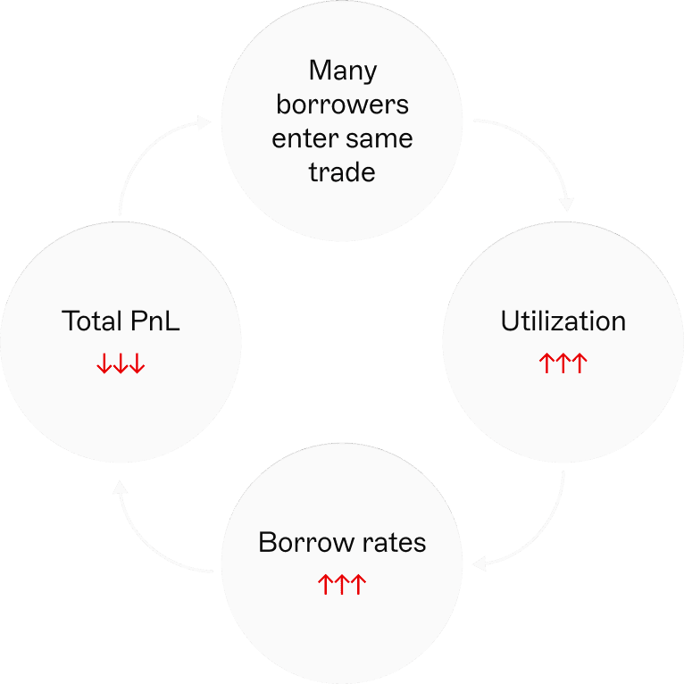 Because utilization can shift quickly due to a single large borrower or multiple entrants crowding the same loop, leveraged borrowers bear asymmetric downside risk.