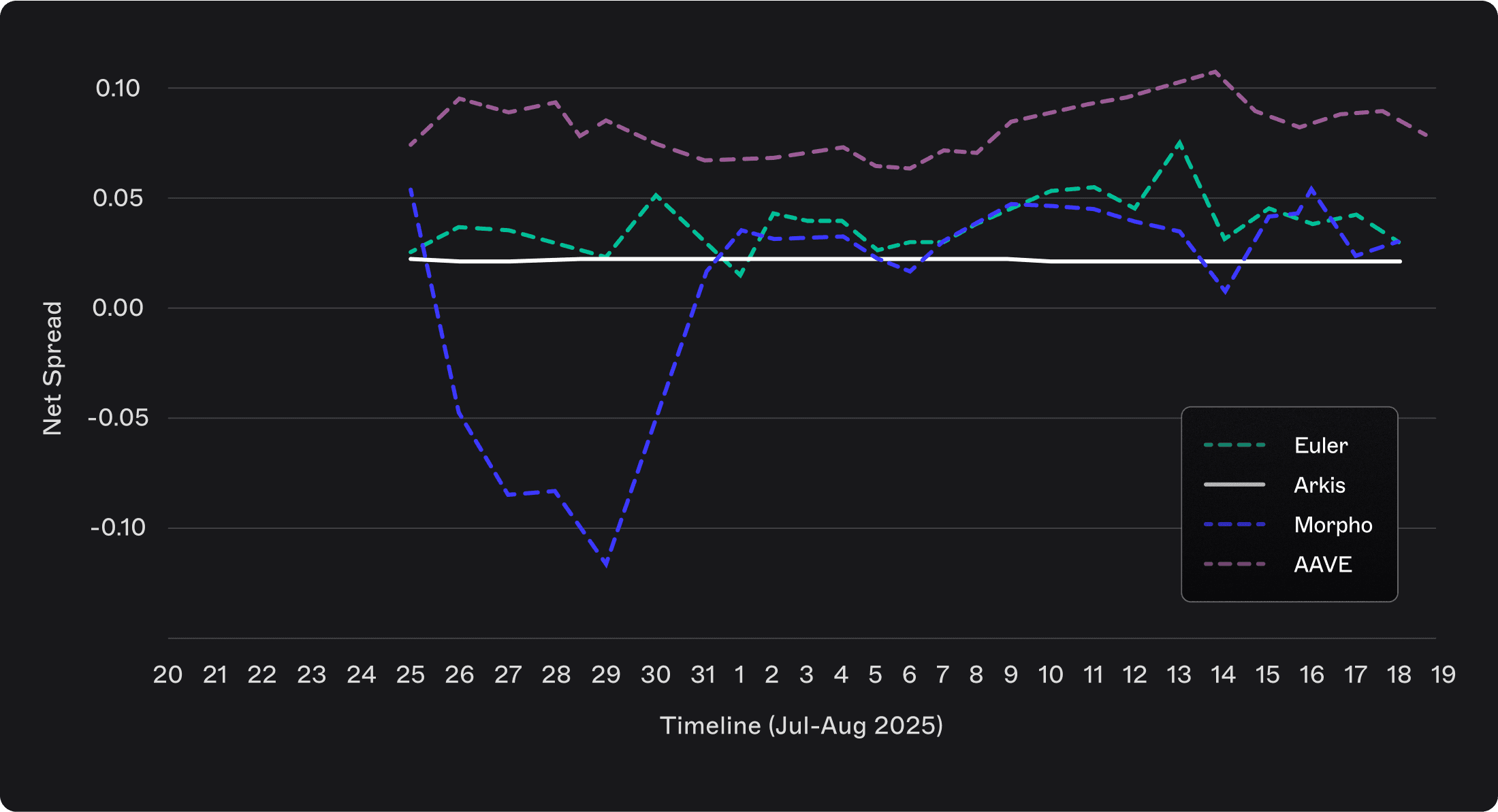 The chart below tracks how the net spread evolved over time for each protocol, revealing differences in market structure and risk management.