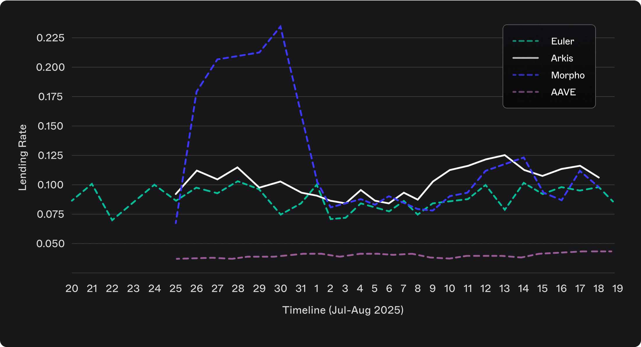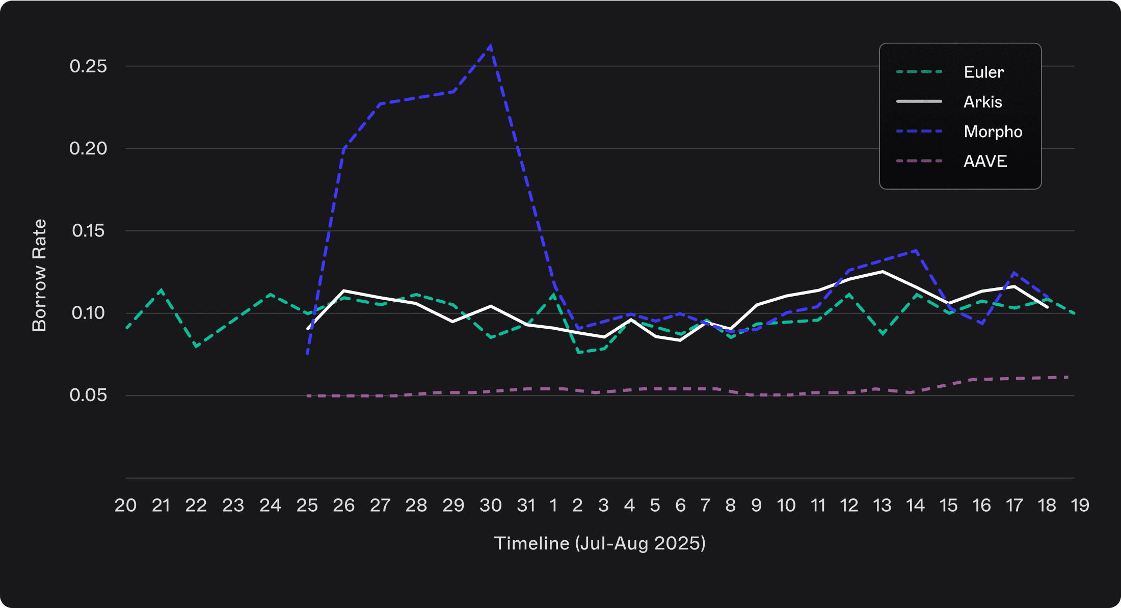 Borrowing rates mirror these dynamics. Arkis, Euler, and Morpho borrowers face costs aligned with lender expectations, whereas Aave borrowers consistently benefit from artificially low rates. The notable outlier is Morpho’s late-July spike in borrowing costs, which would have disrupted ongoing looping strategies by suddenly erasing profitability.