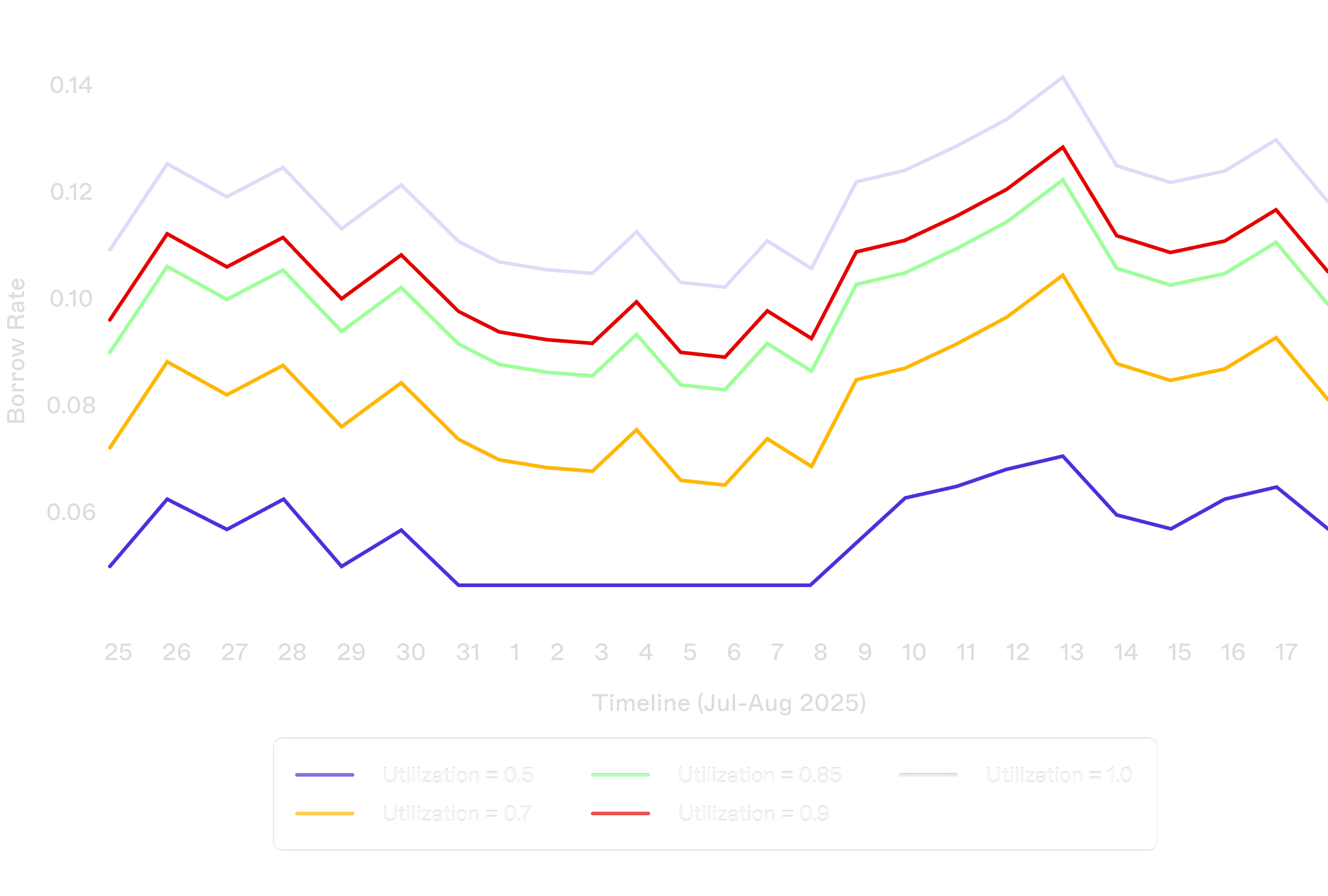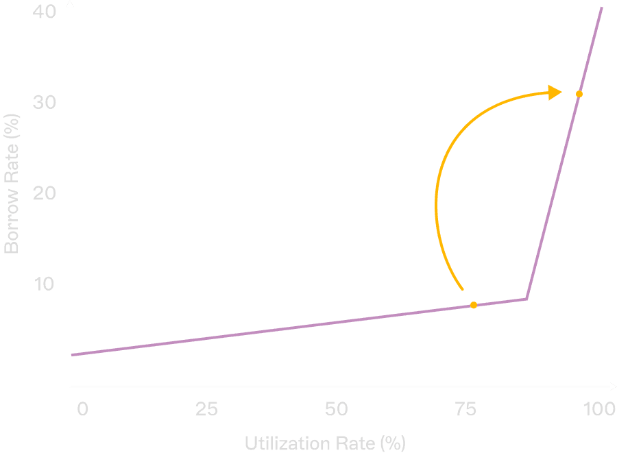 Borrow rates in utilization-based models are highly sensitive to small changes in utilization. The presence of a “kink” point — where rates accelerate sharply once utilization crosses a threshold — forces borrowers to self-assess their capacity before entering a position.