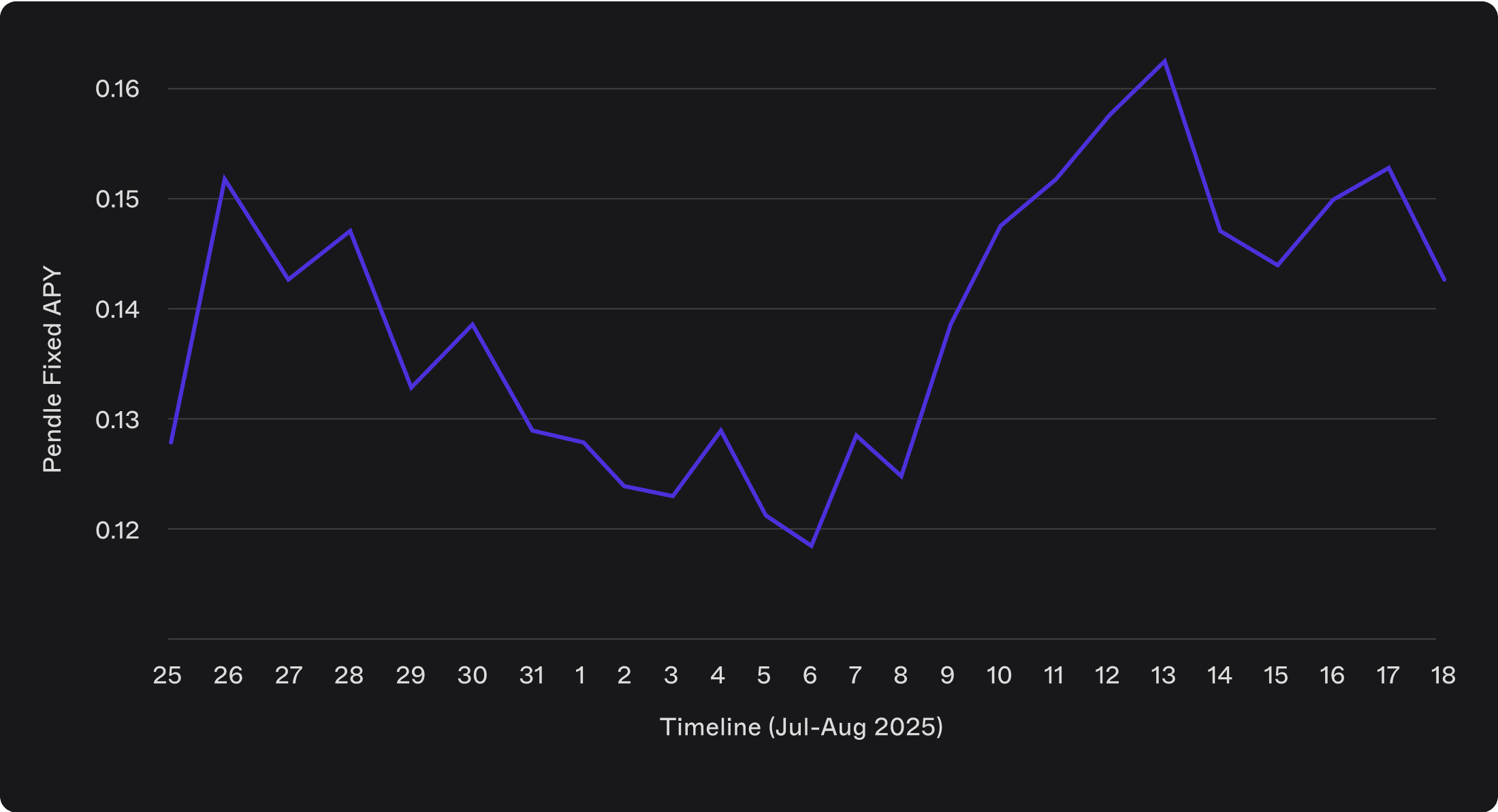 We begin with the baseline: the Pendle PT USDe implied APY over time. This rate represents the return a borrower can earn by supplying their collateral into the Pendle market. Periods of drawdown — such as the sustained dip in early August, shown in the chart — compress the profitability of looping trades, while the mid-August upswing expands margins and creates more favorable conditions.