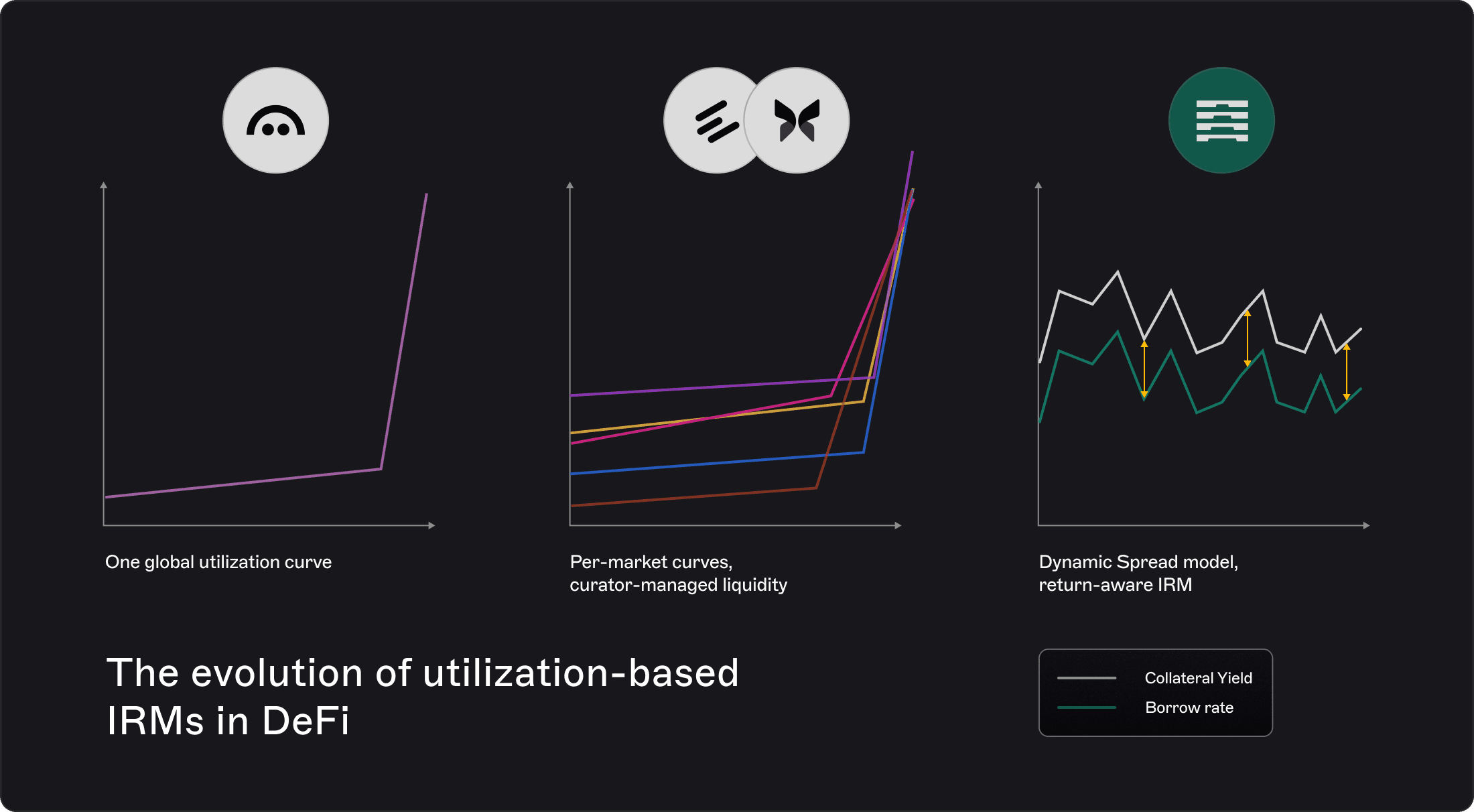 The first successful example was Aave’s pure utilization curve, applied for each borrowed assets on the platform. Later iterations — Morpho and Euler — extended this idea by introducing market-specific utilization curves, where each pool’s cost of borrowing depends not only on utilization but also on how effectively curators manage supply liquidity in response to borrowing demand.